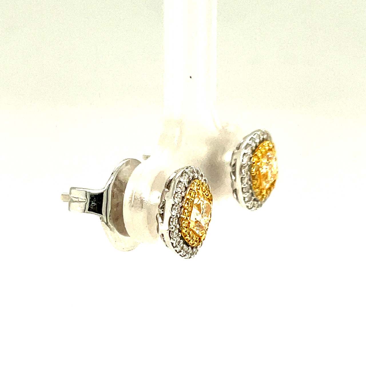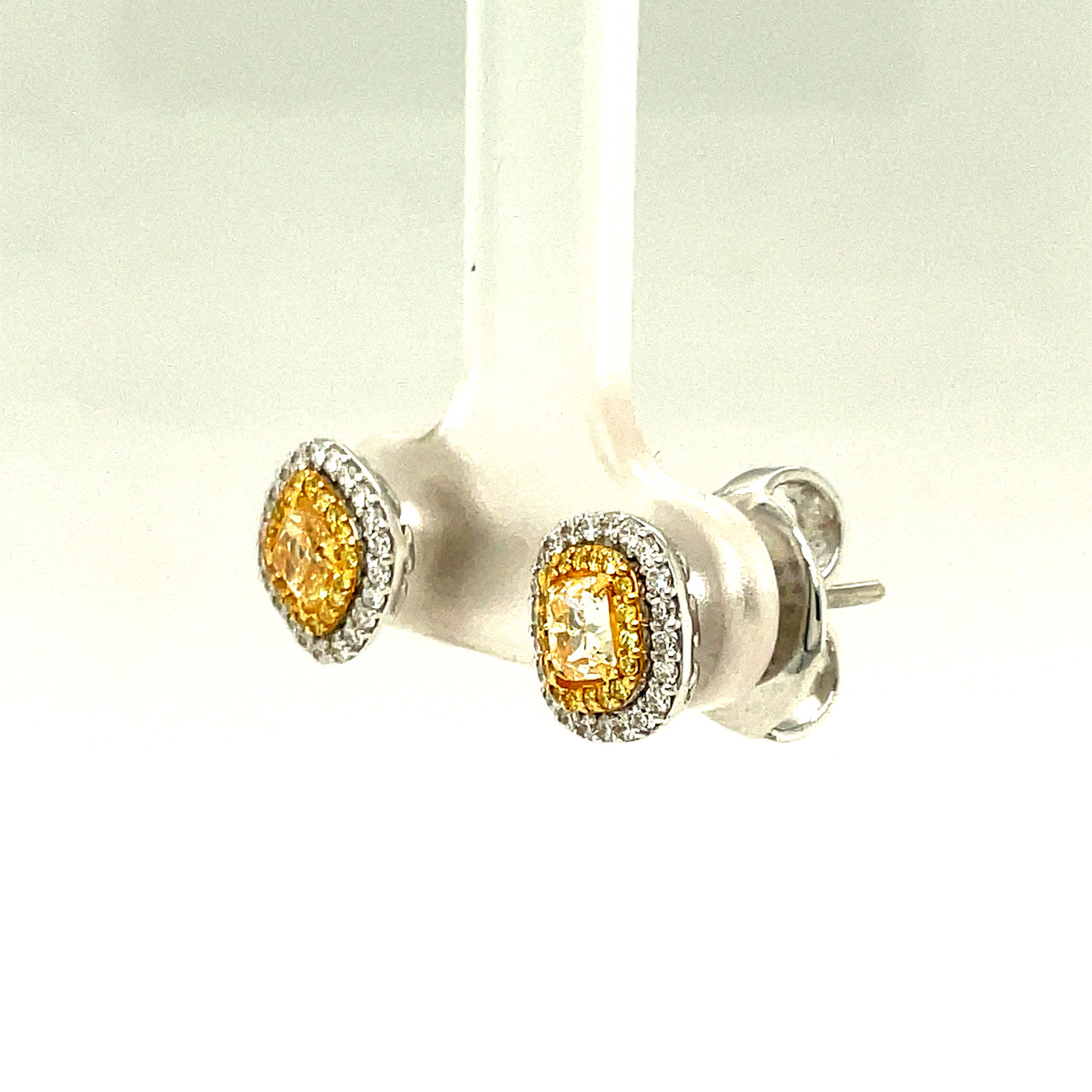 - These yellow diamond earrings have brilliant-cut diamonds surrounded by a claw-set and a cushion cut.