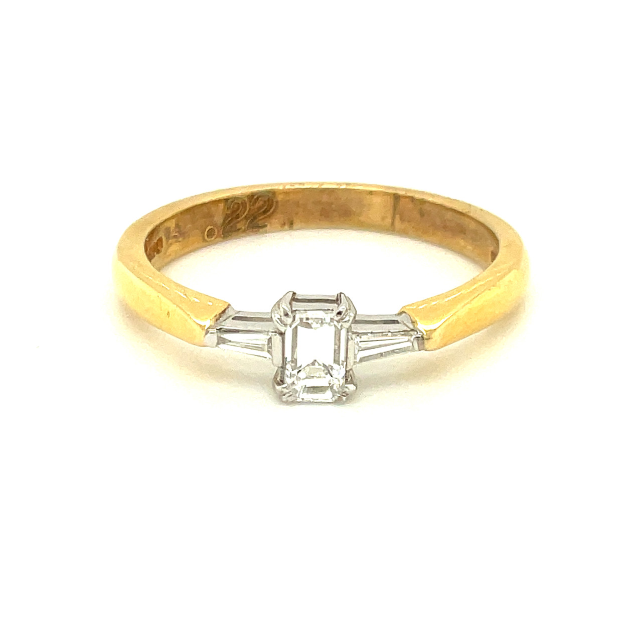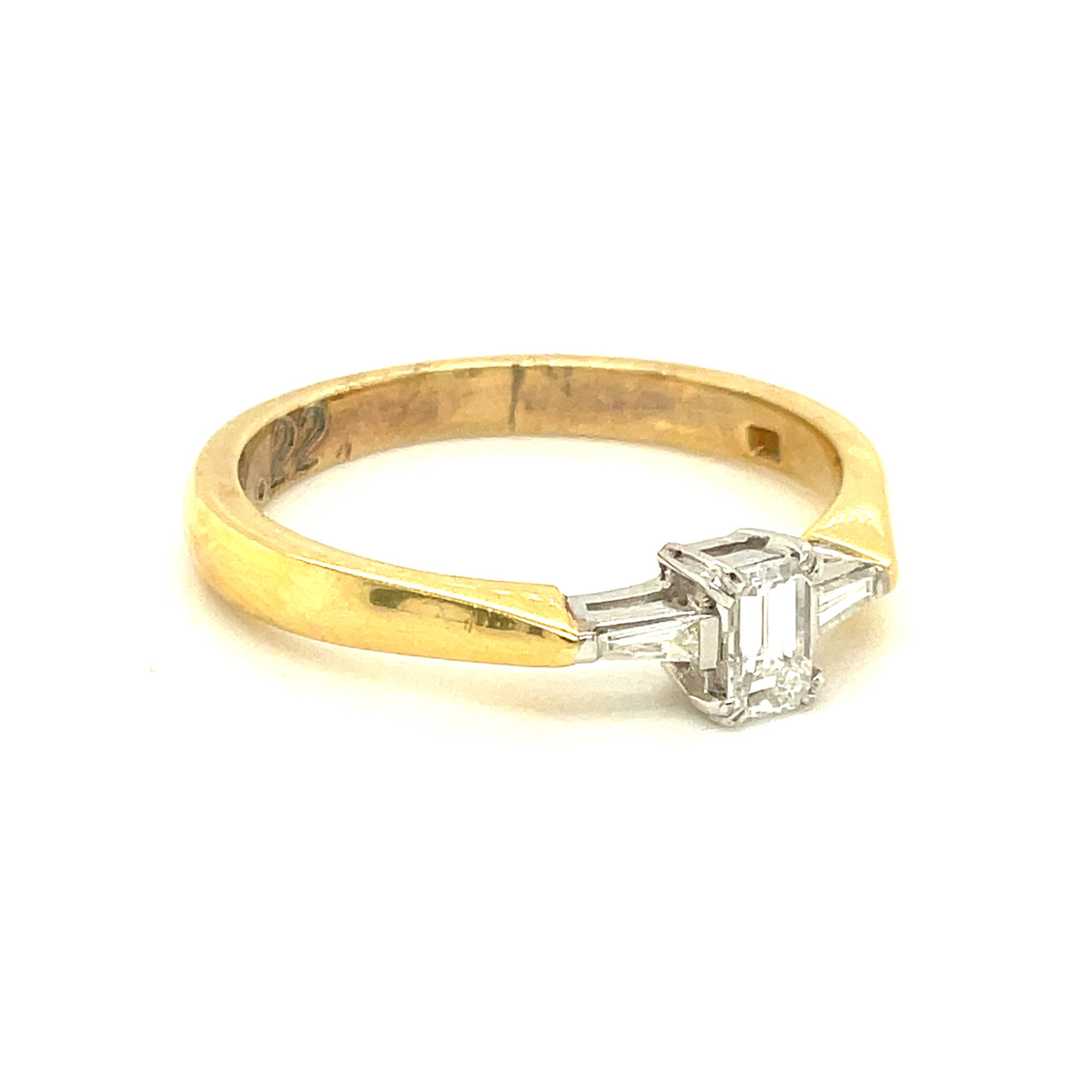 - The 2 tapering baguette-cut diamonds with VS2 clarity that surround the centre baguette-cut stone are claw set.