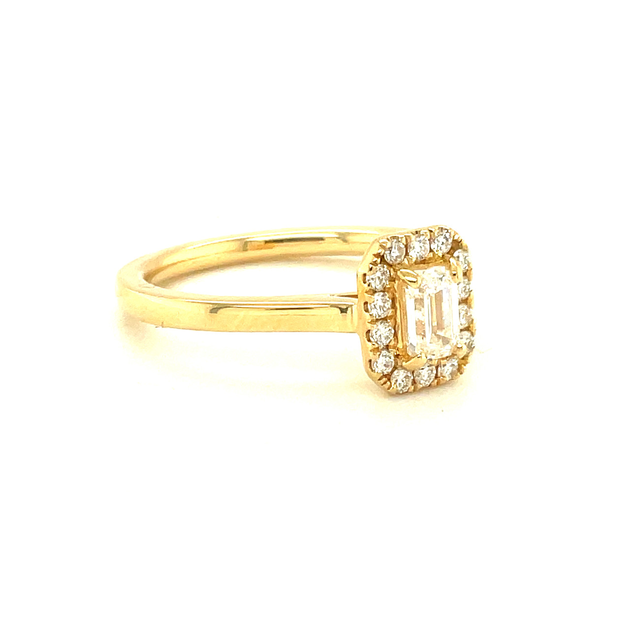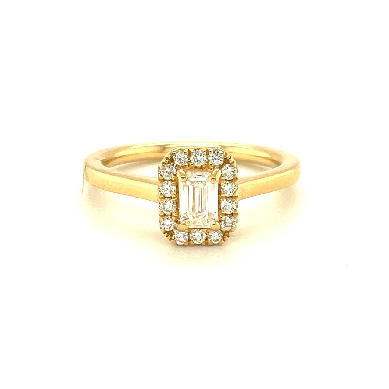 - The baguette cut centre diamond is surrounded by a brilliant-cut claw set.