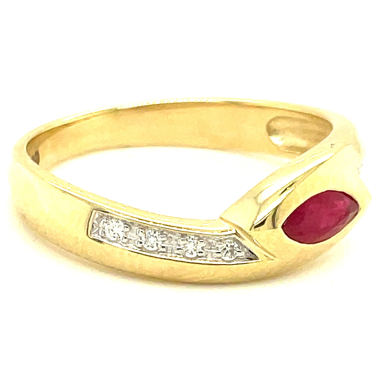 - The marquise cut ruby is surrounded by brilliant-cut diamond rub overs set in ruby claw settings.