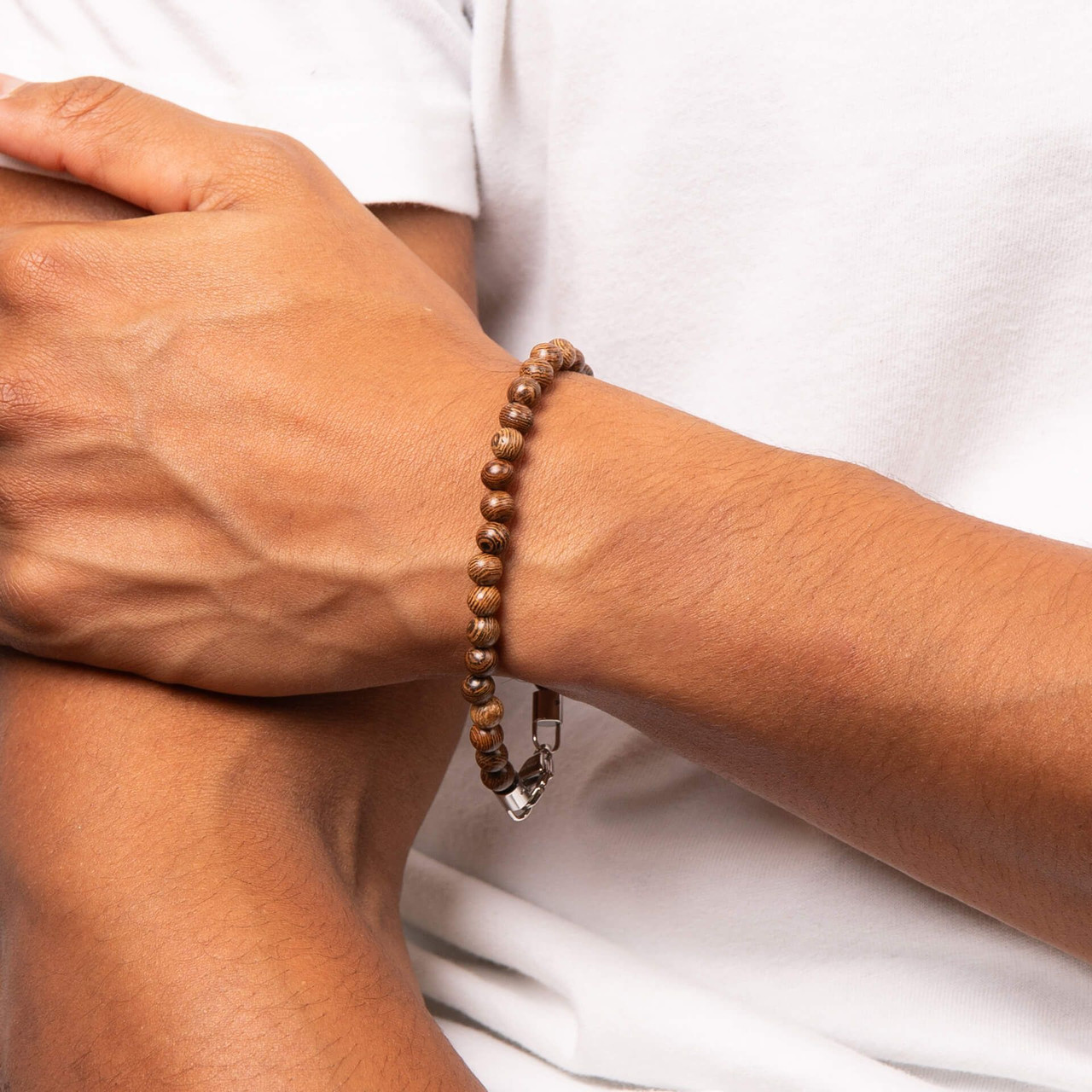- Connecting to nature and serving as a reminder of the world around us, this bracelet is crafted in stainless-steel and features round natural wood beads.