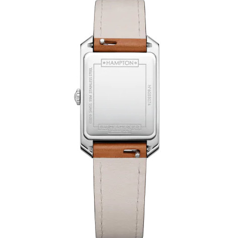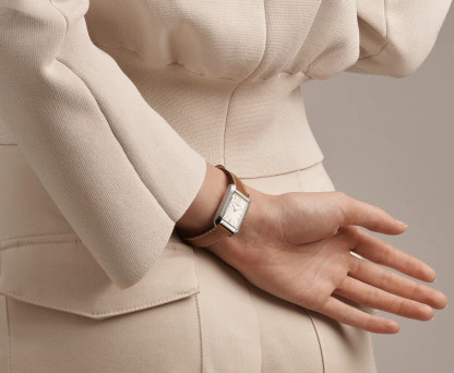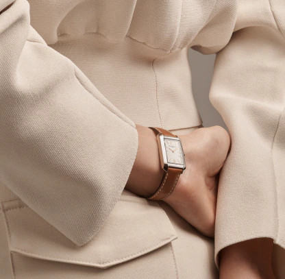 - Light Brown calfskin leather strap with beige stitching and finished with a buckle clasp to ensure security on the wrist.