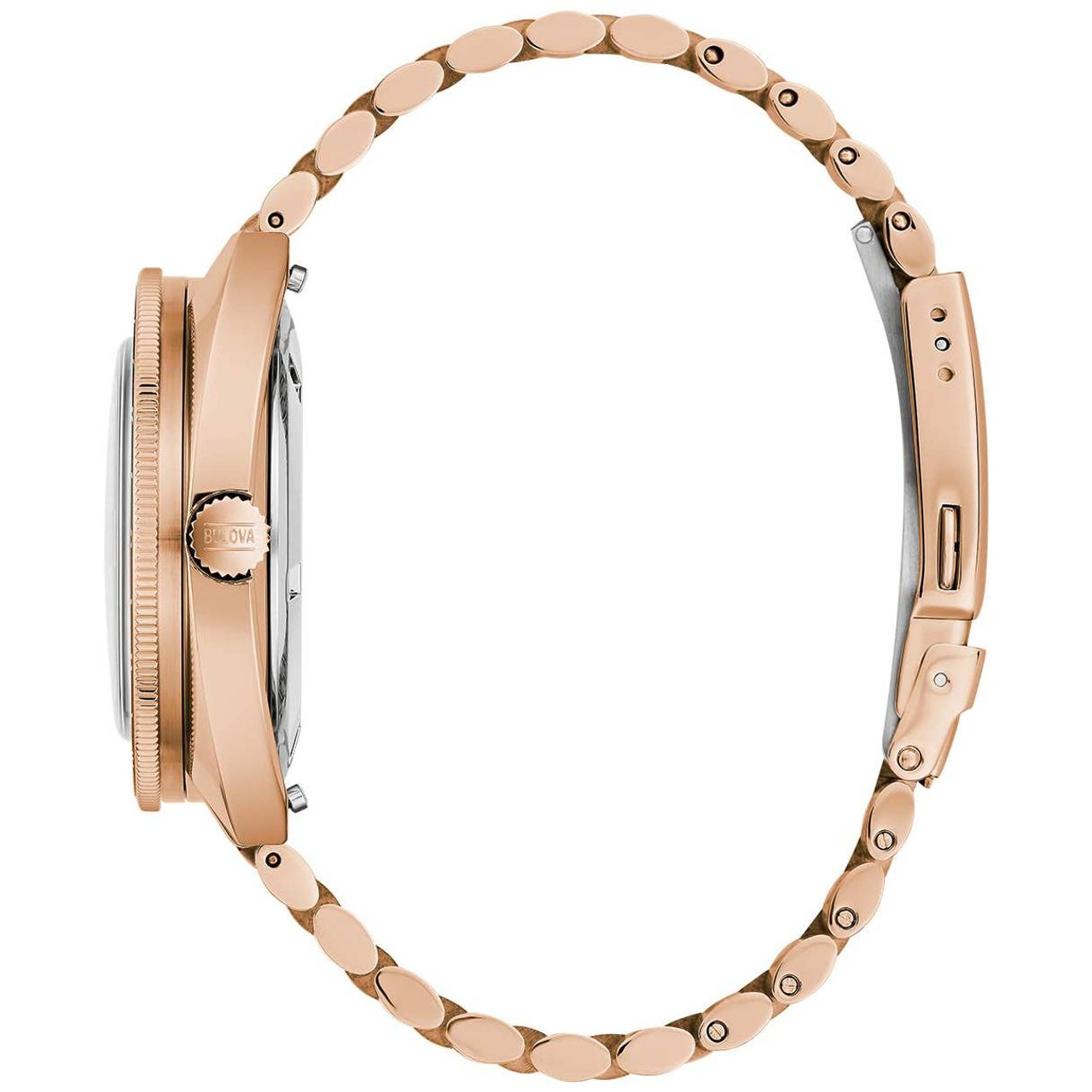 - A stainless-steel rose-gold tone three-link bracelet with a deployment Clasp to ensure security on the wrist.