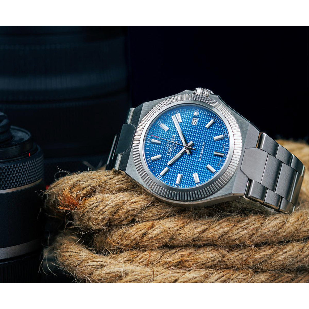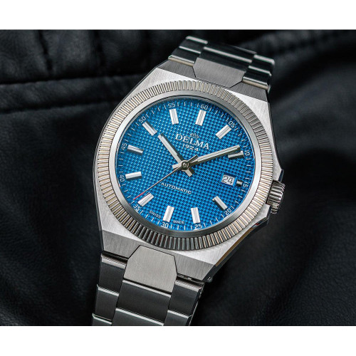 - A royal blue pyramid guilloche pattern HMSD dial Delma men's watch.