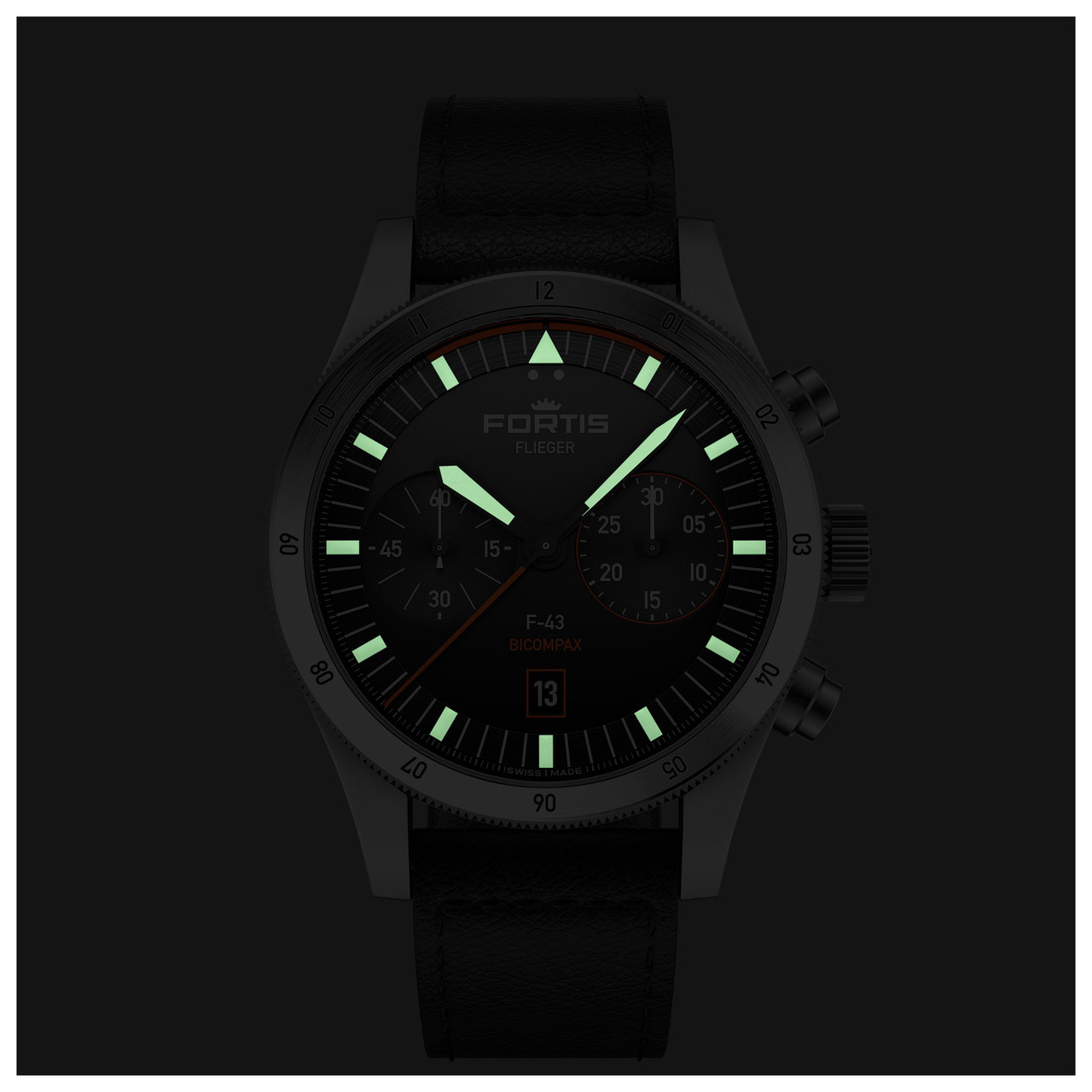 - A black chronograph dial with finely grained base structure Flieger Men's watch.