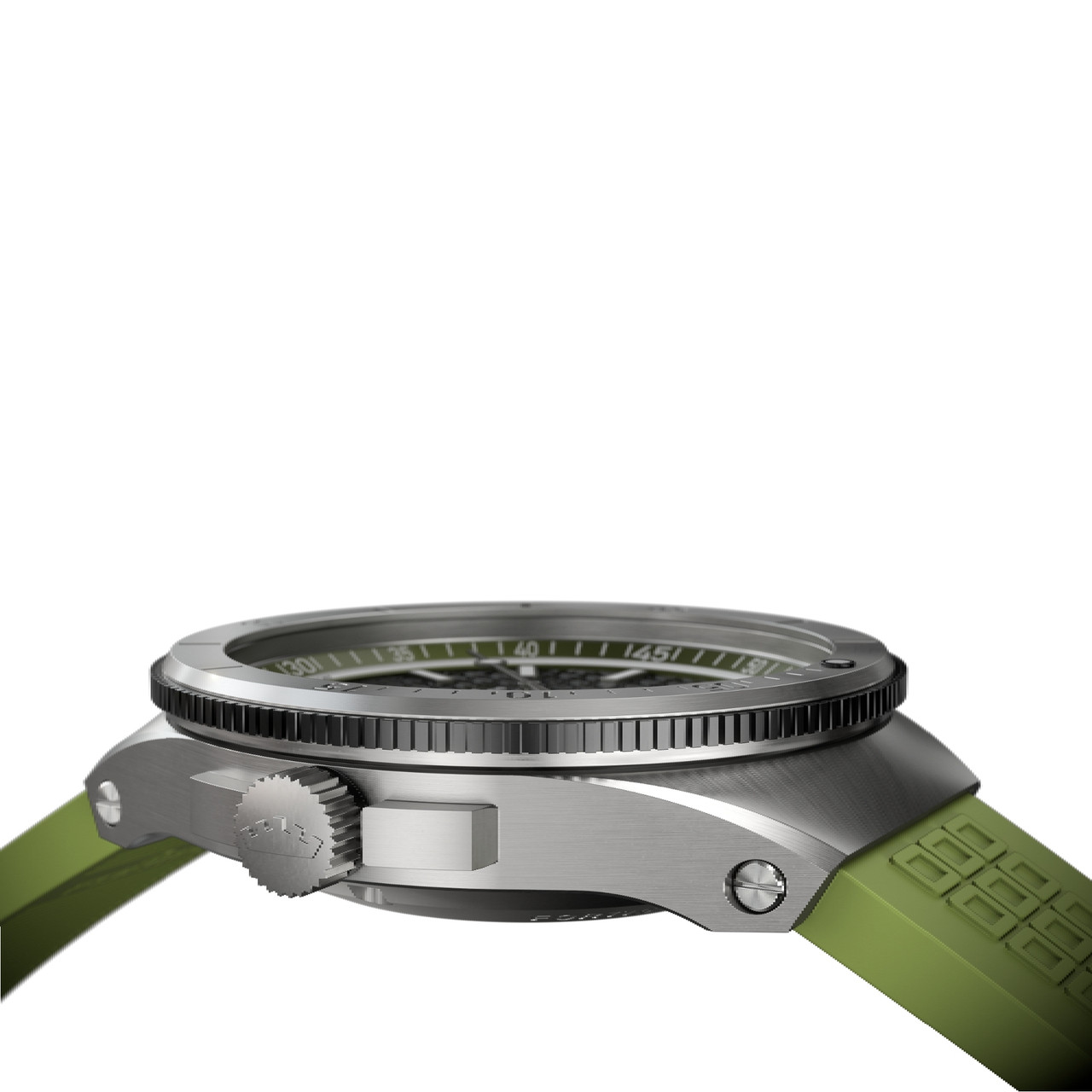 - A woodpecker green rubber strap finished with a folding clasp to ensure security on the wrist.