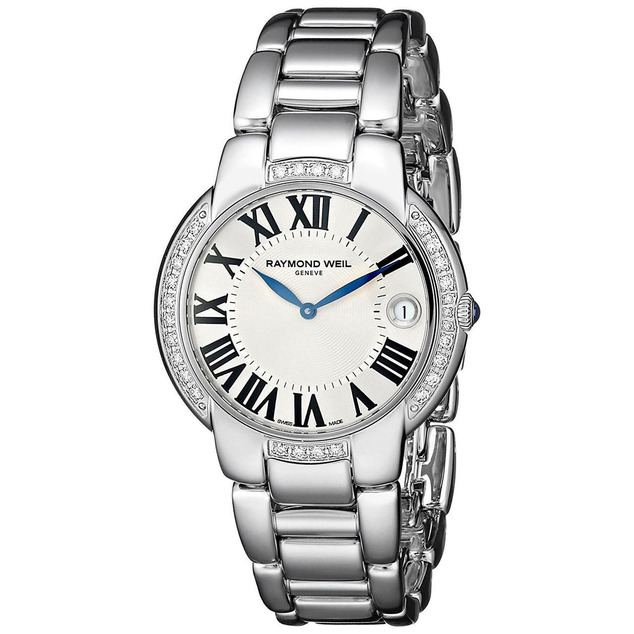 - This watch from the Raymond Weil collection features a silver dial with black hands, and the "Raymond Weil" logo at the 12 o'clock.