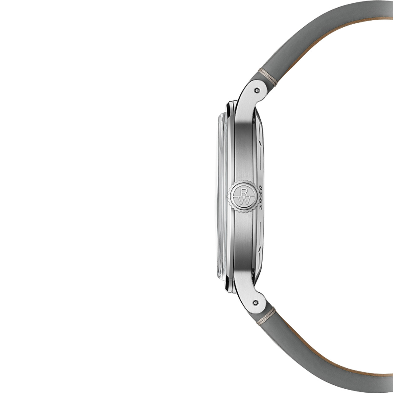 - Grey genuine calf leather strap with a unique W-stitched detail finished with a stainless-steel traditional buckle clasp to ensure security on the wrist.