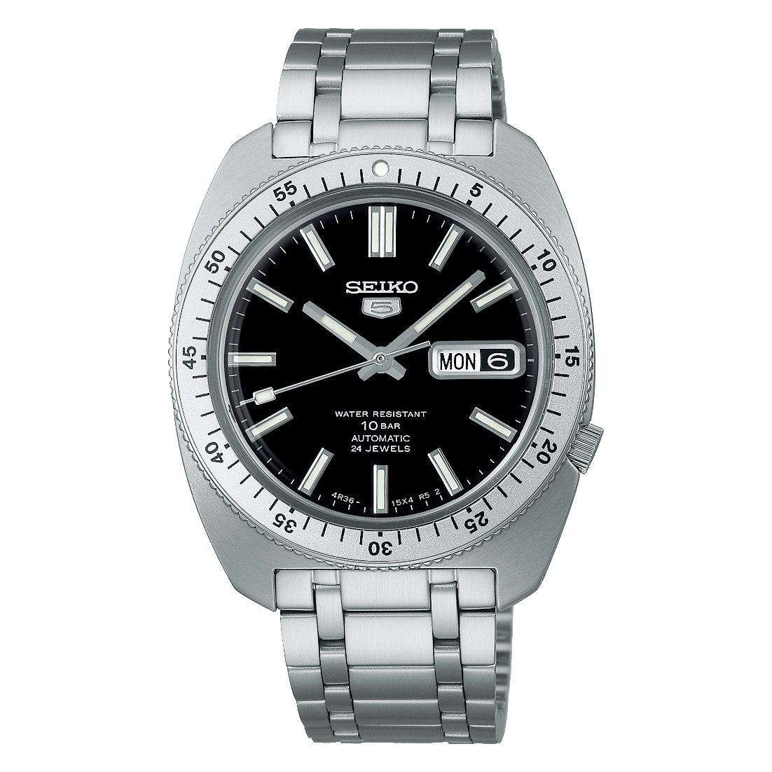 - Similar to its 60s inspiration, it features the vintage Seiko 5 emblem logo on the black dial with a black and white day-date feature.