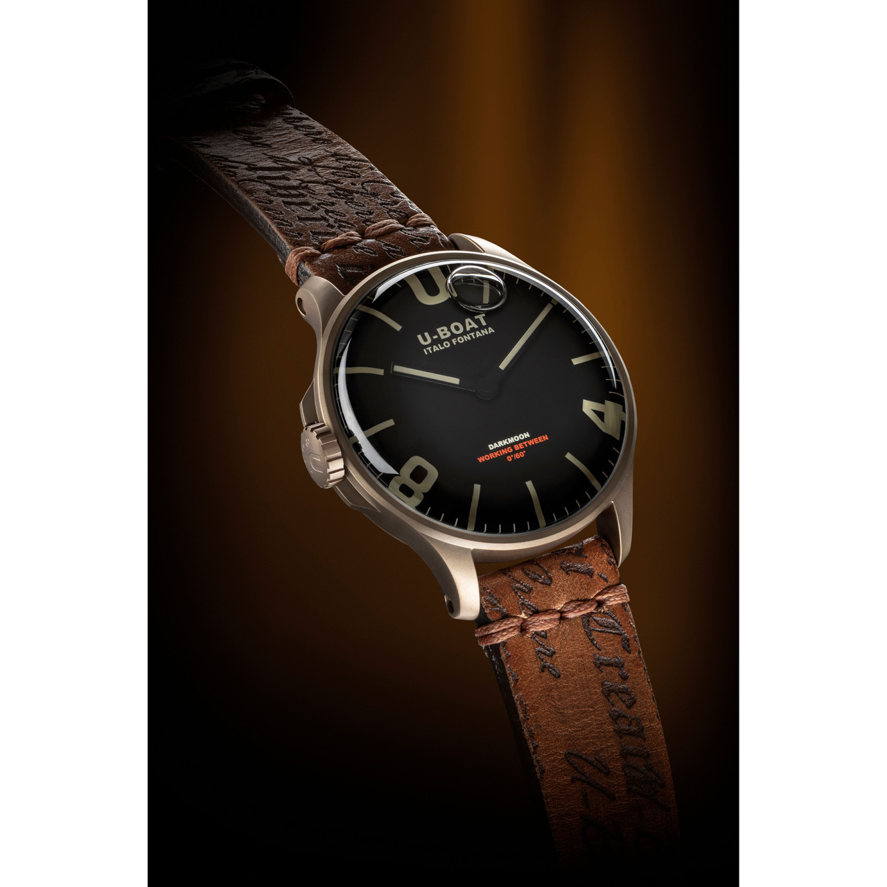 - Stainless-steel AISI 316L with subsequent IP Bronze treatment case watch, filled with a special oil that emphasises the dial, creating the illusion of the absence of glass and an optical effect of a more intense black and higher legibility.