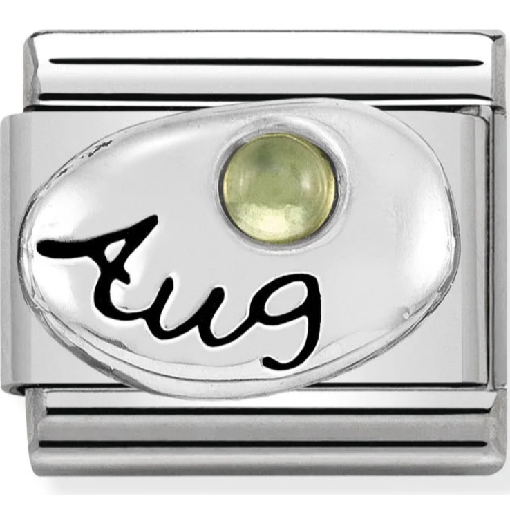 - Green Peridot gemstone with the wording "August" in black enamel.