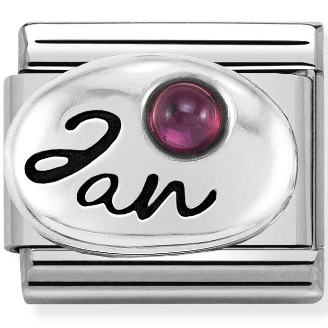 - Garnet gemstone with the wording "Jan" in black enamel.