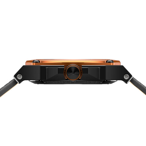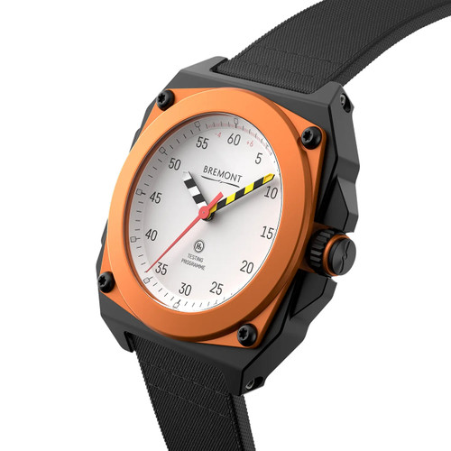 - The vibrant orange anodised aluminium case middle is secured with 4 corner Torx® screws and on the dial, hours are marked with Super-LumiNova® along with the tips of the chevron-decorated hands whose pattern nods to the signature ejection pull handles seen on fighter ejection seats.