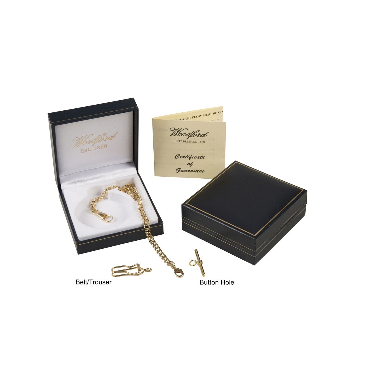 - Classic white dial with clear black roman numerals gold plated twin-lidded watch case with chain.