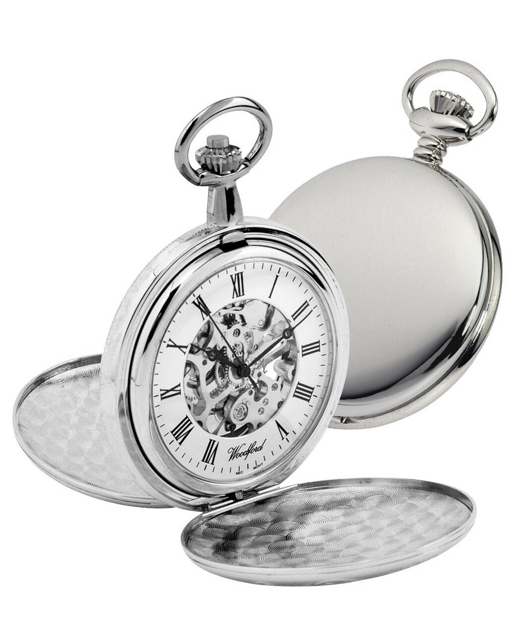 - Twin-lidded watch case dial with roman numerals chrome finished with chain.