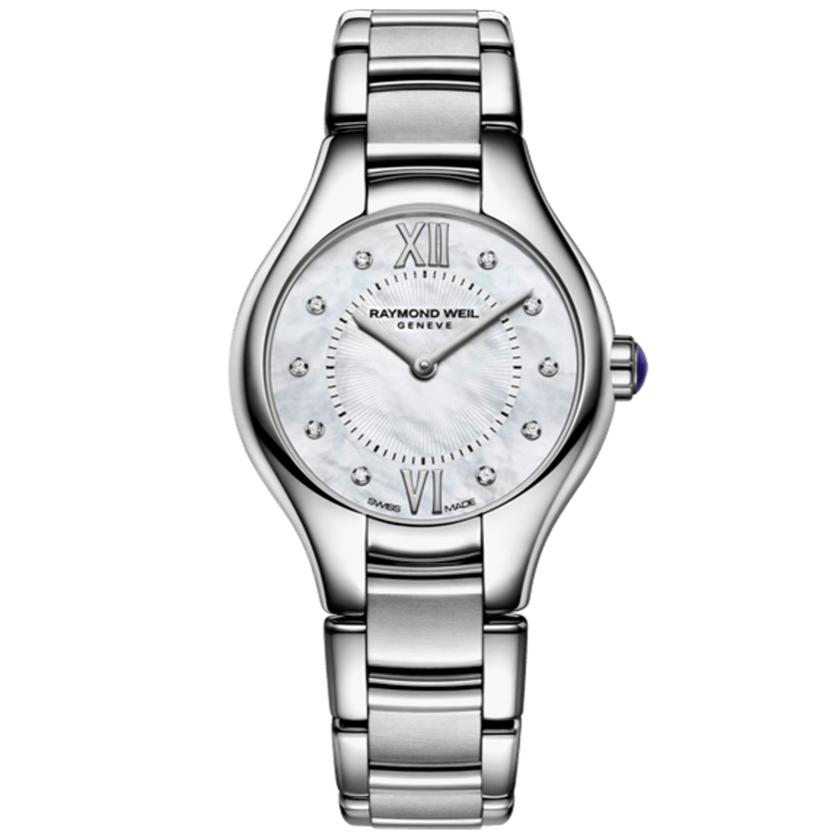 - This watch from the Raymond Weil collection features a mother of pearl dial with 10 diamond hour markers, and the "Raymond Weil" logo at the 12 o'clock.