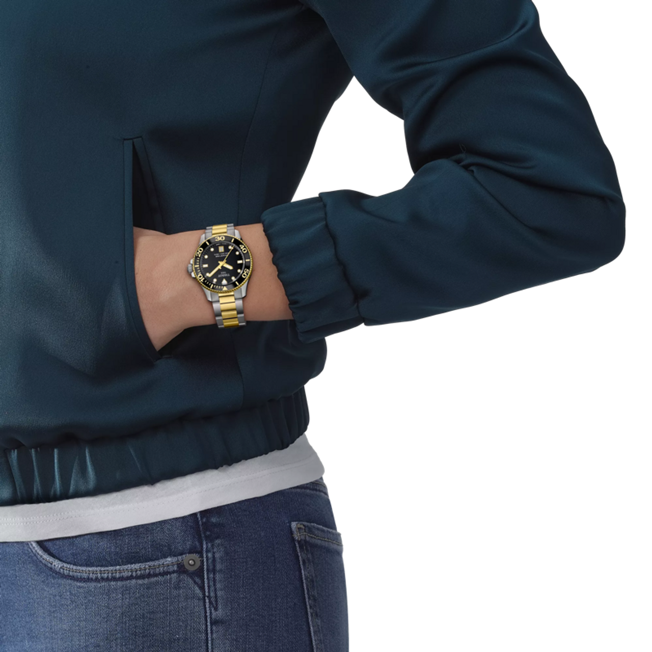 - A two-tone (grey, yellow gold) stainless-steel interchangeable quick-release bracelet with a folding clasp and push-buttons to ensure security on the wrist.