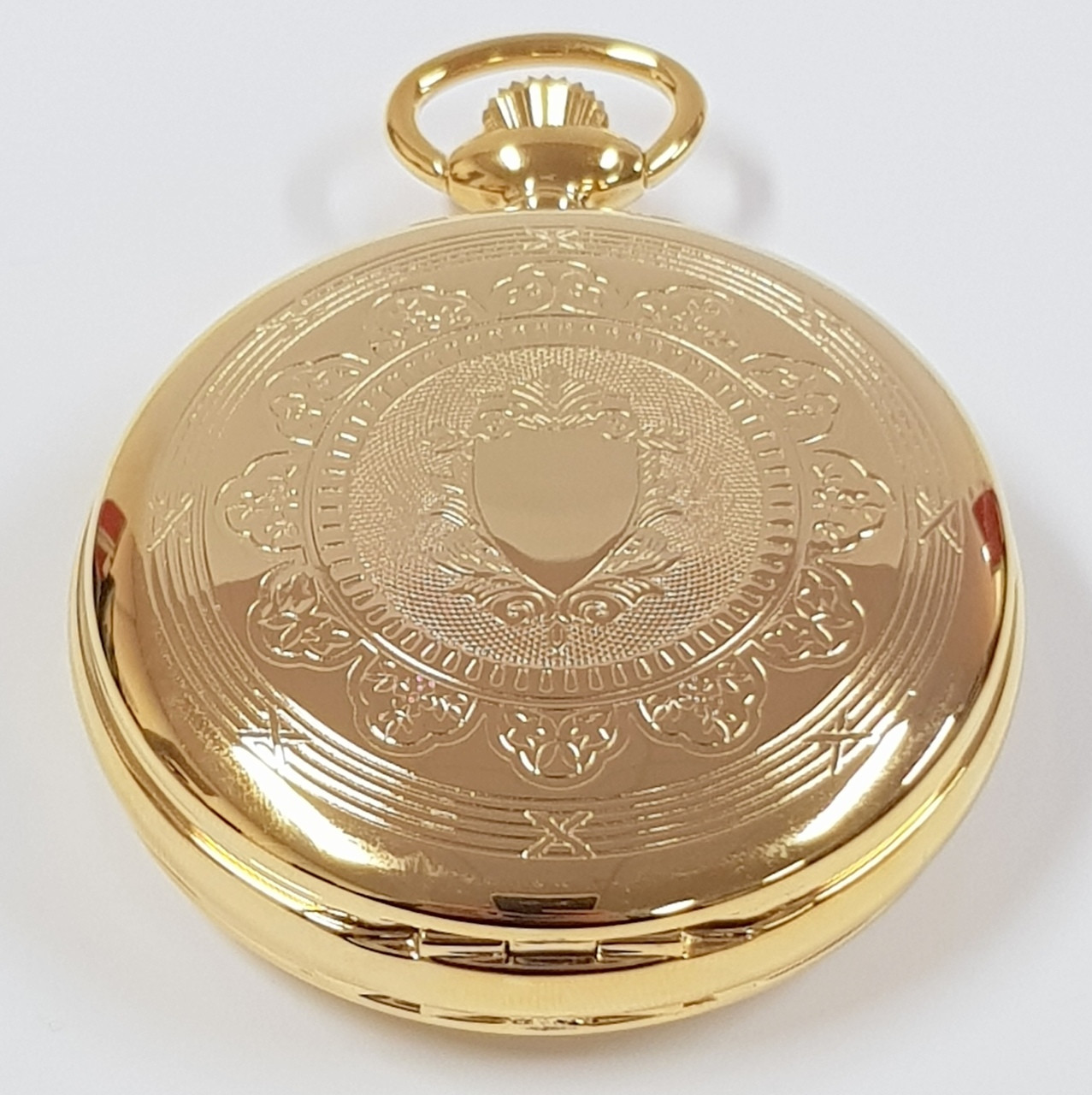 - Sun and moon phase dial with roman numerals gold plated twin-lidded watch case with chain.